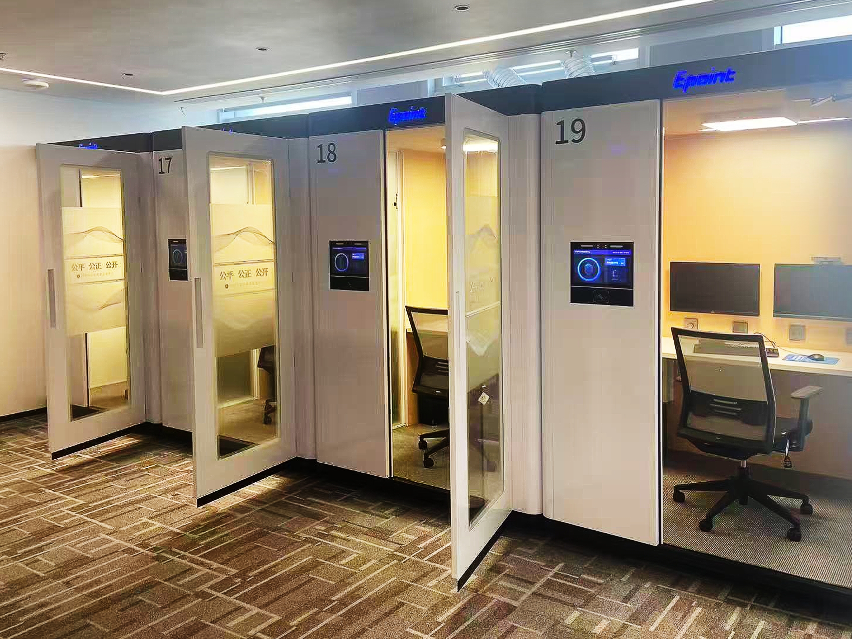 走進(jìn)交易中心評(píng)標(biāo)室,映入眼簾的是一排排采用鋁合金型材、環(huán)保高效吸音材料,及高強(qiáng)度吸音鋼化玻璃一體化打造的獨(dú)立“智能評(píng)標(biāo)艙”。每個(gè)艙體配備低噪聲新風(fēng)系統(tǒng),為每位專家營(yíng)造出“一人一艙”的封閉式專屬評(píng)標(biāo)空間;專家“刷臉”進(jìn)入,全程佩戴智能胸牌,人員軌跡無(wú)感、實(shí)時(shí)記錄,從物理環(huán)境上筑牢了評(píng)審獨(dú)立性與公正性的第一道防線。
