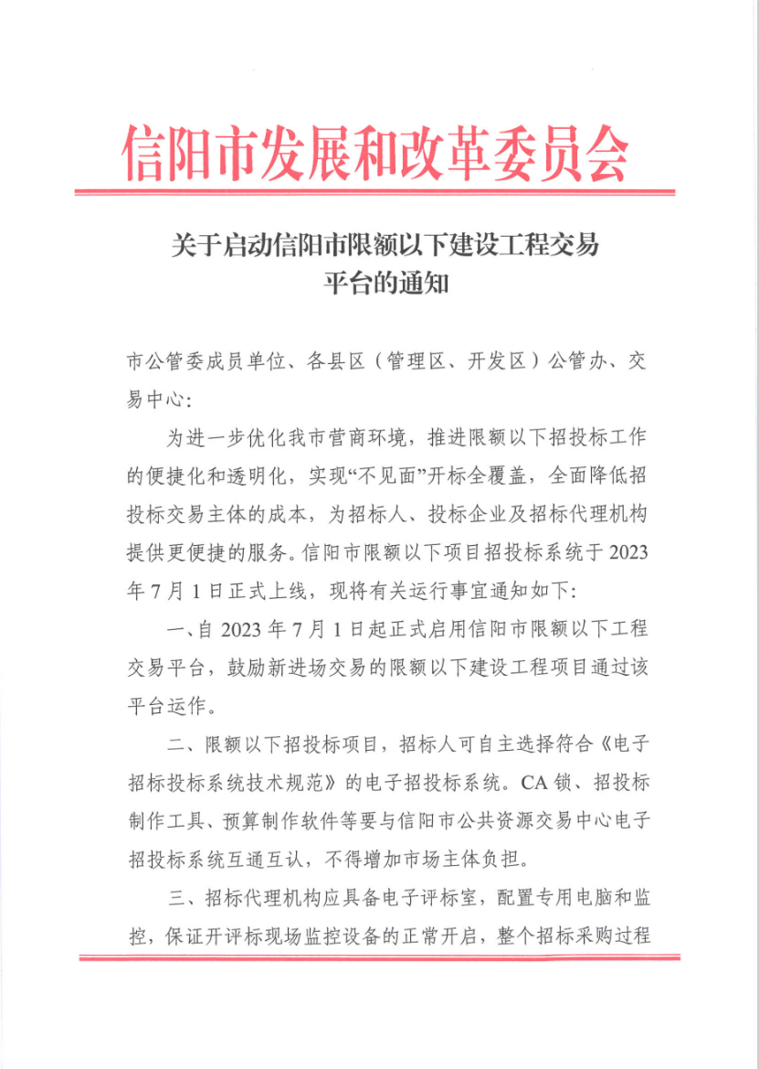 依據信陽市發(fā)展和改革委員會發(fā)布的《關于啟動信陽市限額以下建設工程交易平臺的通知》,提出要鼓勵新進場交易的限額以下建設工程項目通過平臺運作,全面降低招投標交易主體的成本,為各市場主體提供更便捷的服務,營造公開透明的營商環(huán)境。目前,平臺的運行工作已在信陽市全面鋪開。