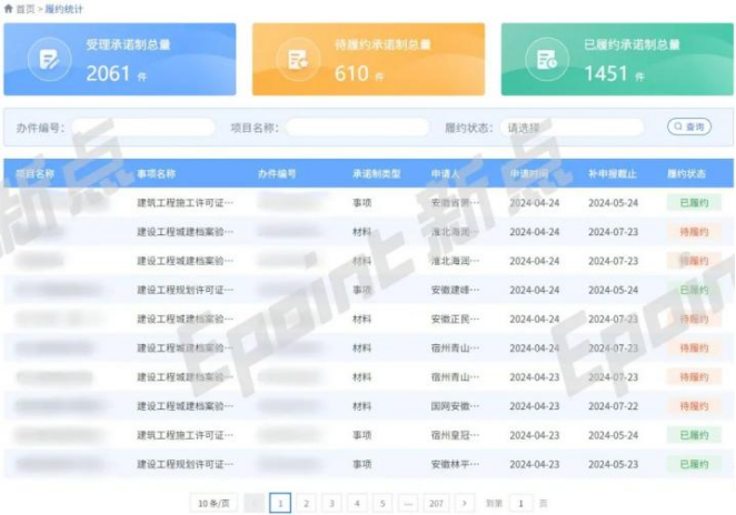 在告知承諾制監(jiān)管領域,推行告知承諾制+清單制服務,打造“事前核查、事中審批、事后監(jiān)管”的閉環(huán)管理體系。目前,系統(tǒng)中已有830個項目申報了2061個告知承諾制辦件,其中已履約1451件,告知承諾制的推廣成效正在逐步提升。